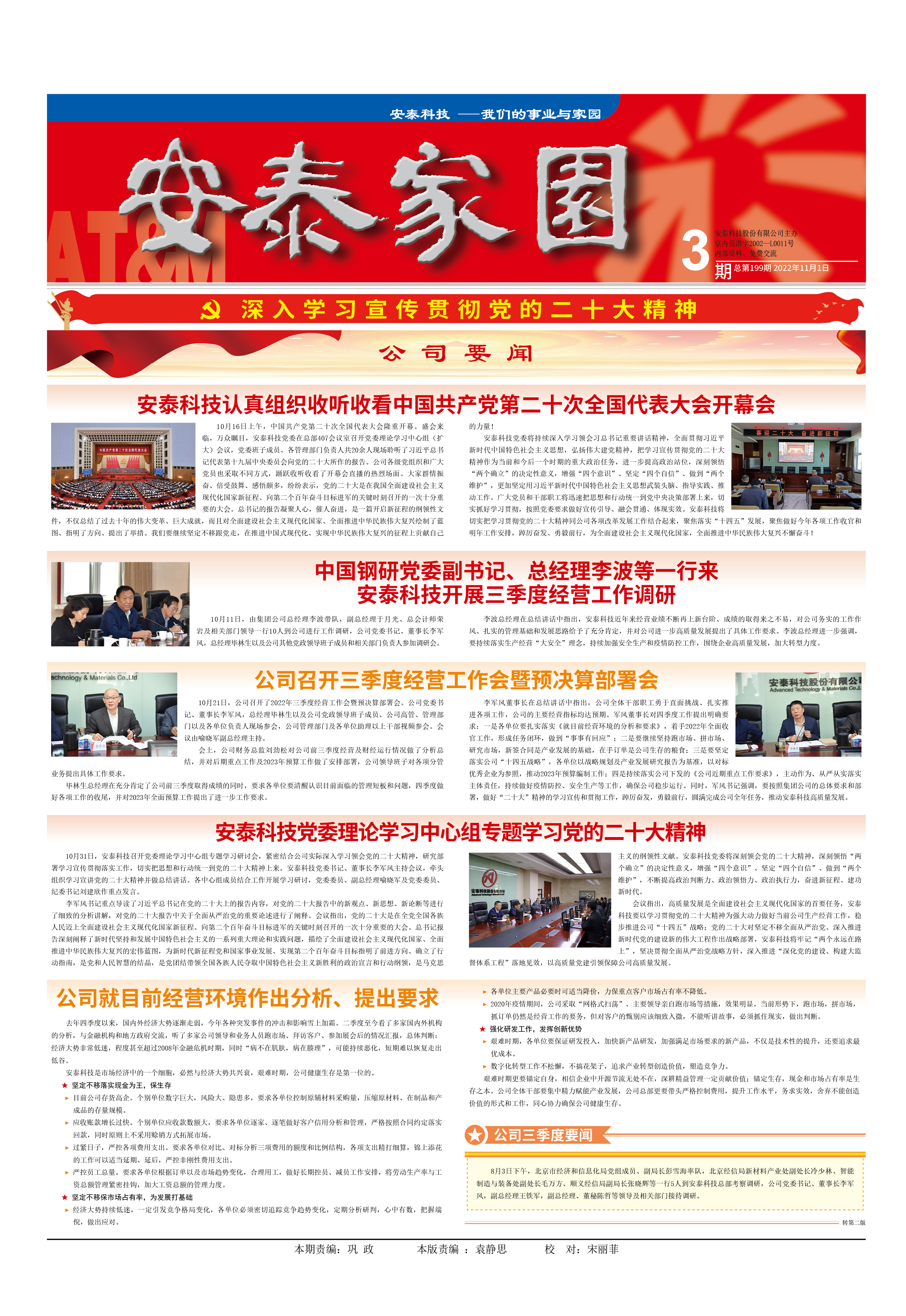 10月16日上午,中國共產黨第二十次全國代表大會隆重開幕。盛會來臨,萬眾矚目,安泰科技黨委在總部407會議室召開黨委理論學習中心組(擴大)會議,黨委班子成員、各管理部門負責人共20余人現場聆聽了習近平總書記代表第十九屆中央委員會向黨的二十大所作的報告。公司各級黨組織和廣大黨員也采取不同方式,踴躍收聽收看了開幕會直播的熱烈場面。大家群情振奮、倍受鼓舞、感悟頗多,紛紛表示,黨的二十大是在我國全面建設社會主義現代化國家新征程、向第二個百年奮斗目標進軍的關鍵時刻召開的一次十分重要的大會??倳浀膱蟾婺廴诵模呷藠^進,是一篇開啟新征程的綱領性文件,不僅總結了過去十年的偉大變革、巨大成就,而且對全面建設社會主義現代化國家、全面推進中華民族偉大復興繪制了藍圖、指明了方向、提出了舉措。我們要繼續(xù)堅定不移跟黨走,在推進中國式現代化、實現中華民族偉大復興的征程上貢獻自己的力量!