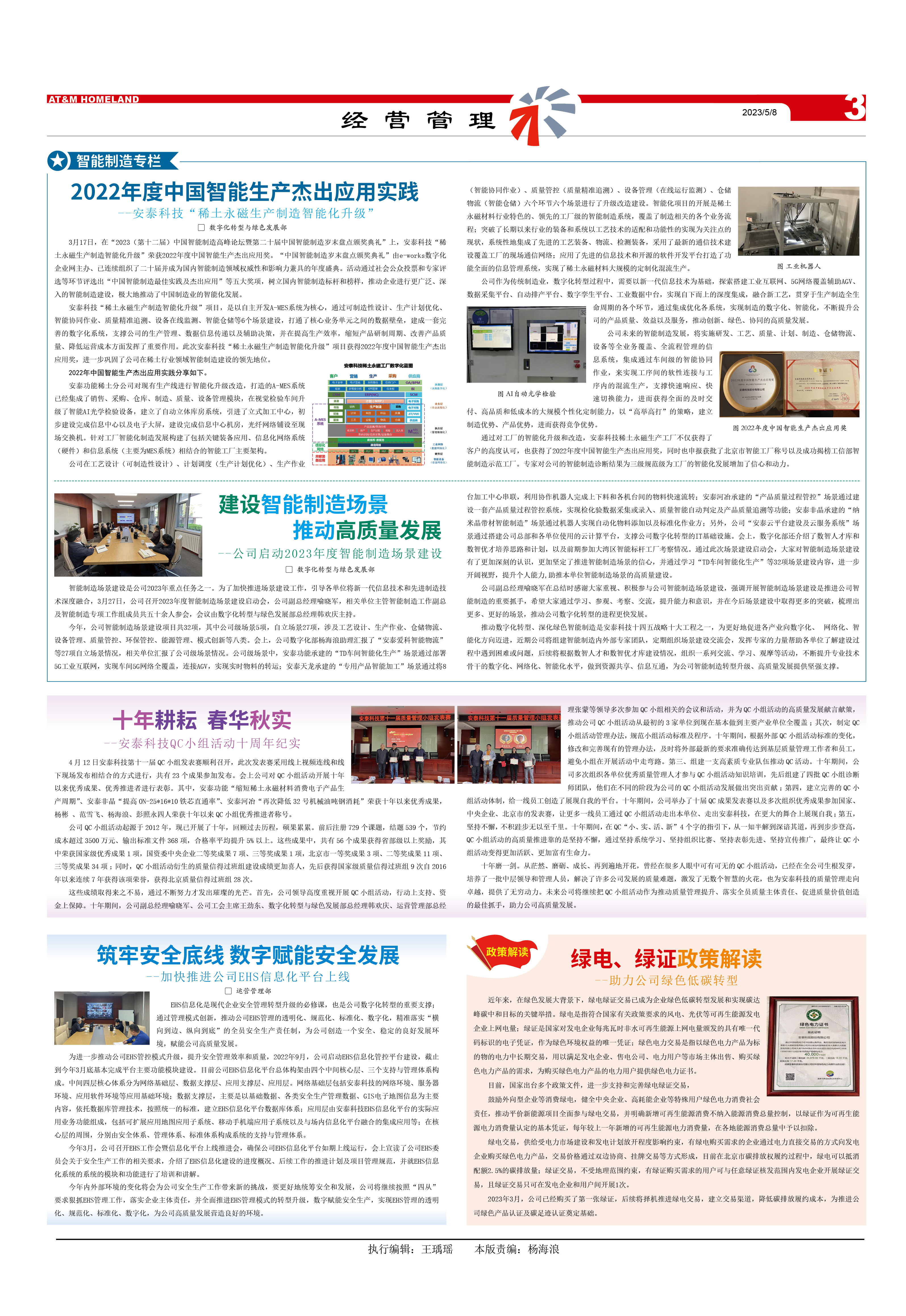 通過對工廠的智能化升級和改造,安泰科技稀土永磁生產(chǎn)工廠不僅獲得了客戶的高度認(rèn)可,也獲得了2022年度中國智能生產(chǎn)杰出應(yīng)用獎,同時也申報獲批了北京市智能工廠稱號以及成功揭榜工信部智能制造示范工廠。專家對公司的智能制造診斷結(jié)果為三級規(guī)范級,為工廠的智能化發(fā)展增加了信心和動力。