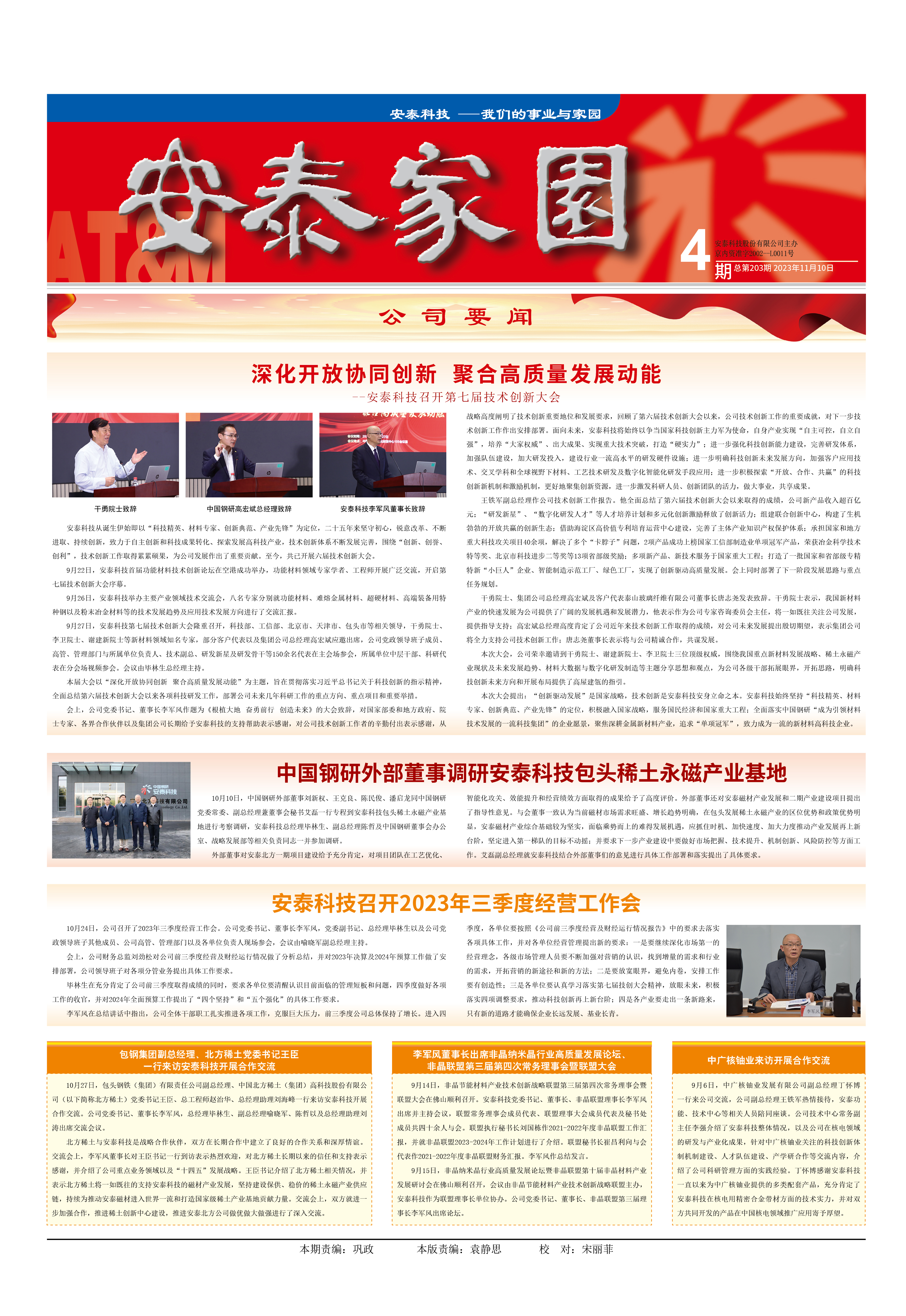 本次大會(huì)提出:“創(chuàng)新驅(qū)動(dòng)發(fā)展”是國(guó)家戰(zhàn)略,技術(shù)創(chuàng)新是安泰科技安身立命之本。安泰科技始終堅(jiān)持“科技精英、材料專(zhuān)家、創(chuàng)新典范、產(chǎn)業(yè)先鋒”的定位,積極融入國(guó)家戰(zhàn)略,服務(wù)國(guó)民經(jīng)濟(jì)和國(guó)家重大工程;全面落實(shí)中國(guó)鋼研“成為引領(lǐng)材料技術(shù)發(fā)展的一流科技集團(tuán)”的企業(yè)愿景,聚焦深耕金屬新材料產(chǎn)業(yè),追求“單項(xiàng)冠軍”,致力成為一流的新材料高科技企業(yè)。