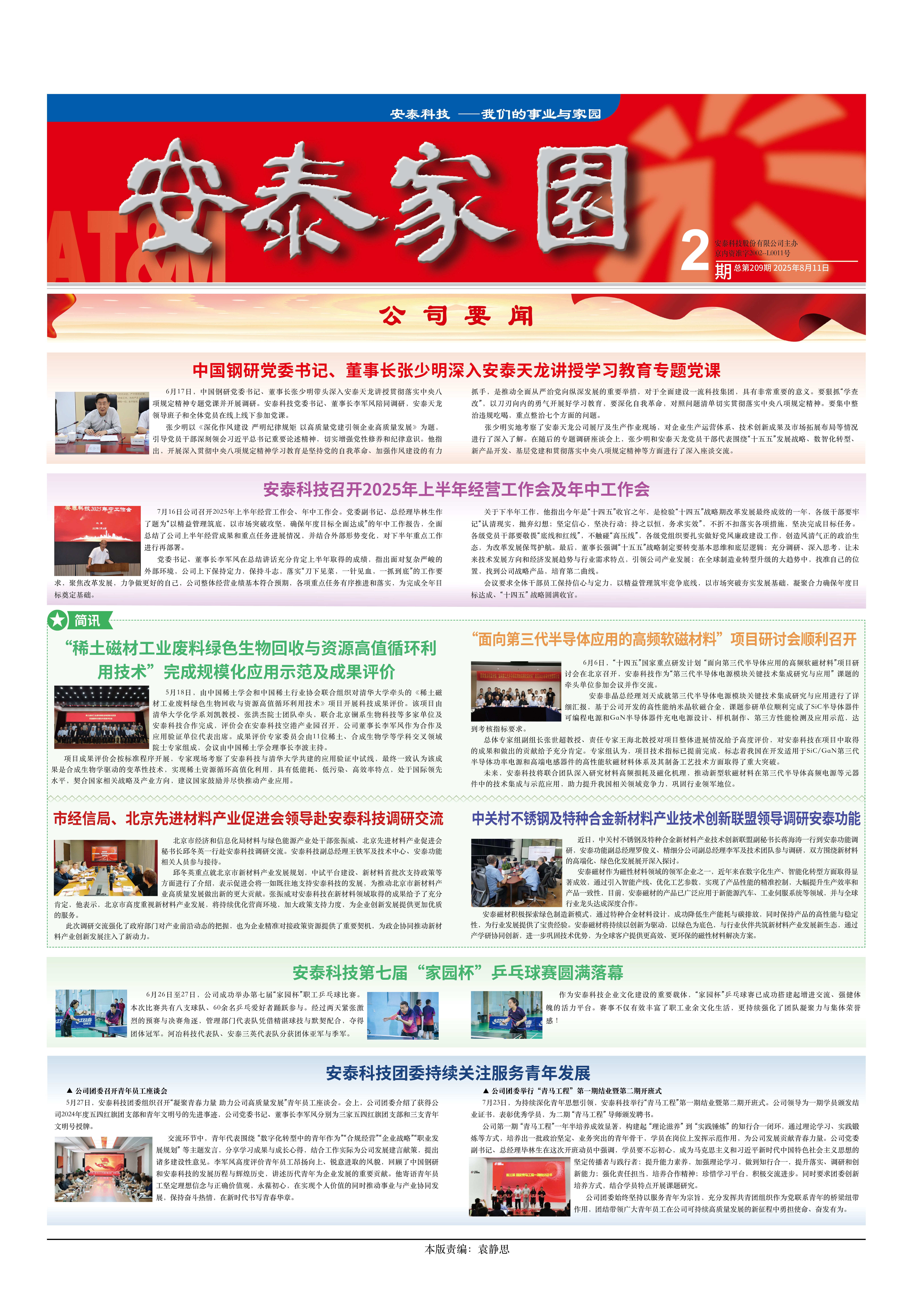 6月17日,中國鋼研黨委書記、董事長張少明帶頭深入安泰天龍講授貫徹落實中央八項規(guī)定精神專題黨課并開展調(diào)研。安泰科技黨委書記、董事長李軍風陪同調(diào)研,安泰天龍領(lǐng)導班子和全體黨員在線上線下參加黨課。